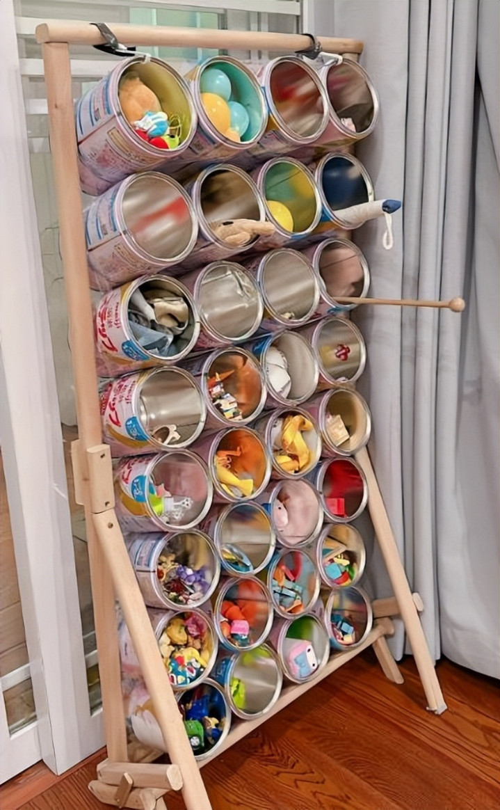 家里喝完的奶粉罐,全都留下来,搭配一个木架子,就变成了收纳置物架。