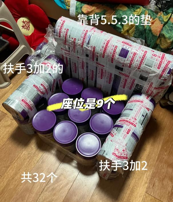 比如,我家这个小沙发,就是用奶粉罐diy的。