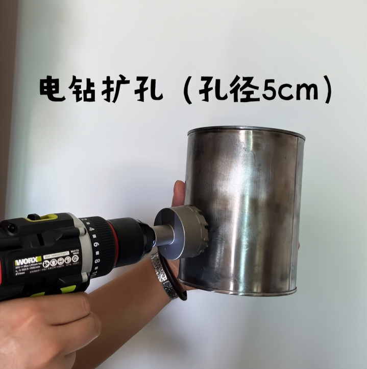 在奶粉罐中间部分,开个孔,孔径大概5cm左右即可。